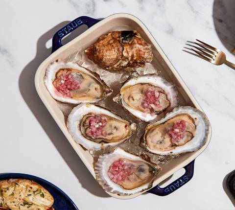 Another simple addition is local oysters, which my husband shucks right before our guests arrive. I make the mignonette — minced shallots in red wine vinegar with salt and pepper — up to a week ahead of time and serve the oysters atop crushed ice. Now, along with the shrimp cocktail, our oysters have become the opening act for our evening’s feast.