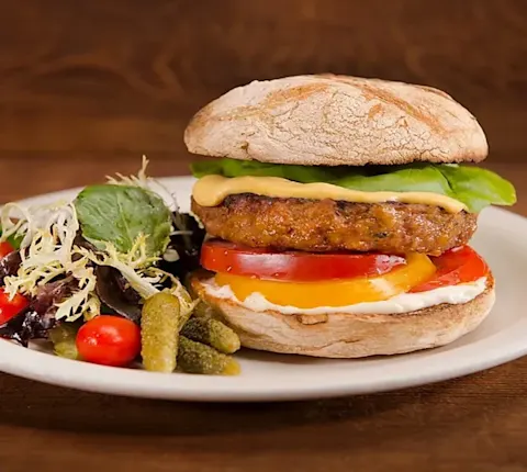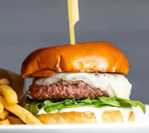 Si lo que buscas es una hamburguesa gruesa al estilo de un restaurante, elaborada con la sensibilidad de un asador, no busques más allá de The Golden Bull, el restaurante especializado en filetes de Santa Mónica de toda la vida. Un par de toques especiales, como el queso cheddar ahumado y la lechuga mantequilla, elevan esta clásica hamburguesa con queso a otro nivel, al igual que las papas fritas espolvoreadas con hierbas que se sirven como guarnición. El sándwich se completa con cebolla roja, pepinillos, rodajas de tomate y «salsa de lujo», una descripción adecuada para esta creación de lujo y totalmente satisfactoria.