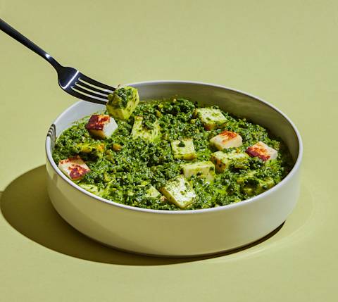 El palak paneer es un popular plato indio con cubitos de paneer (un queso de vaca blando que no se derrite) cocidos a fuego lento en una salsa de espinacas hecha puré y especiada. Esta versión se prepara rápidamente con ingredientes fáciles de encontrar para lograr una cena de semana llena de sabor y nutrientes. Primero, lleva una olla grande con agua a hervir. Añade 1 libra de espinacas frescas al agua hirviendo. Cocina durante unos 30 segundos, hasta que las espinacas se ablanden. Escurre las espinacas en un colador. Lleva las espinacas a un procesador de alimentos y tritura durante unos 20 segundos, haciendo pausas para raspar los lados cuando sea necesario. Deja a un lado.