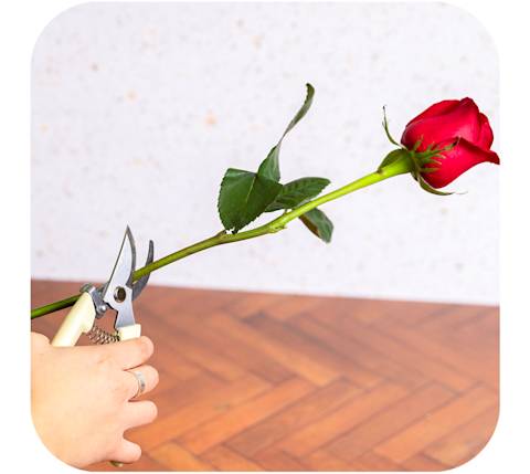 Une fois que tu as une idée de la façon dont tu vas regrouper tes fleurs, il est temps de les tailler pour les adapter à ton contenant. La chose la plus importante, dit Hand, est que les fleurs et leur verdure, c.-à-d. les feuilles, se trouvent au-dessus du bord du vase. « On ne veut jamais voir de feuilles dans l’eau, dit-elle. Cela aura l’air négligé; il est important de couper la verdure avant de la mettre dans le vase. »