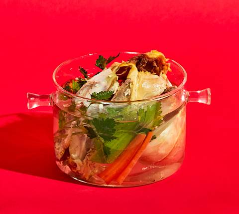 À la fin de la semaine (ou lorsque vous avez mangé toute la viande), placez la carcasse dans une casserole d’eau froide avec une carotte et un oignon, tous deux coupés en deux avec la peau. Portez le tout à ébullition, puis réduire immédiatement le feu pour laisser frémir. Je n’ai jamais compris le céleri dans un bouillon, mais s’il vous parle, ajoutez une ou deux tiges grossièrement hachées.